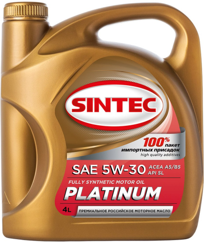 Синтетическое моторное масло «SINTEC PLATINUM SAE 5W-30, ACEA A5/B5 API SL» производится из специально подобранных базовых масел произведённых по синтетической технологии и высокоэффективного пакета присадок. Предназначено для максимальной защиты бензиновых и дизельных двигателей современных автомобилей, работающих в различных условиях эксплуатации. Обладает превосходными низкотемпературными свойствами. Обеспечивает быстрый и легкий запуск двигателя при низких температурах, превосходную защиту двигателя от износа и увеличенный интервал замены. Предотвращает образование отложений в масляной системе.